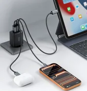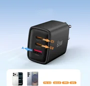 Doté de deux ports Type-C et d'un port USB-A, le chargeur offre une grande polyvalence pour une utilisation quotidienne. Les deux ports Type-C délivrent un maximum de 65 W chacun avec la prise en charge Power Delivery, ce qui est parfait pour recharger les MacBook Airs, les ultrabooks et autres ordinateurs portables modernes. Le port USB-A offre 60 W avec la prise en charge Quick Charge 3.0, ce qui permet de charger rapidement les appareils plus anciens. Les trois ports peuvent fonctionner simultanément grâce à une distribution intelligente de l'énergie.