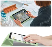 Grâce à la couverture en accordéon sur la face avant de l'étui, nous obtenons une protection de l'écran et, grâce à la technologie de réveil et de mise en veille de l'appareil, nous pouvons assurer une autonomie légèrement plus longue. L'étui peut également servir de support pour une utilisation plus confortable de l'appareil.