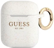 Housse en silicone GUESS. L'étui en silicone protège la station d'accueil pour casque sans fil Apple AirPods contre les dommages de surface et les rayures. L'étui en silicone de haute qualité s'intègre parfaitement dans l'étui d'origine des AirPods et est extrêmement agréable au toucher. Sur le côté du boîtier se trouve un anneau en or pratique qui vous permet de fixer l'étui par exemple à la laisse. Des effets visuels supplémentaires ajoutent une finition pailletée.