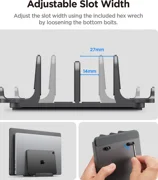 Chaque fente du support est entièrement réglable. Vous pouvez régler la largeur de 14 à 27 millimètres, ce qui permet d'adapter parfaitement le support à des appareils d'épaisseur variable. Que vous travailliez sur un ultrabook fin ou un ordinateur portable de jeu plus épais, votre équipement sera placé en toute sécurité à l'endroit prévu.