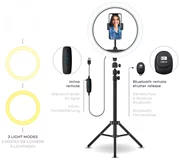 Le kit d'éclairage complet et compact comprend également un trépied pliable avec rotule et un support de smartphone réglable avec col de cygne, compatible avec les appareils de toutes tailles. Une télécommande Bluetooth est également incluse qui se connecte à votre téléphone et dispose d'un déclencheur pour prendre des photos ou filmer à distance. L'éclairage annulaire est doté d'un câble de 1,9 m de long avec une télécommande intégrée pour régler la luminosité et la température de couleur. Il peut être alimenté par n'importe quel chargeur mural compatible, ordinateur de bureau ou ordinateur portable via sa prise USB-A. Pour créer les images et les vidéos que vous souhaitez, vous avez 10 niveaux de luminosité