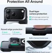 L'étui est une combinaison d'un dos rigide et dur en PC et acrylique et d'un cadre souple en TPU renforcé aux angles. En plus de la protection surélevée standard autour des lentilles, l'étui est équipé d'un cadre métallique ouvrant qui peut être facilement transformé en un support fonctionnel. Il comporte des caches pour les boutons et des découpes pour les ports.