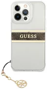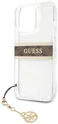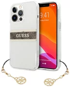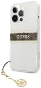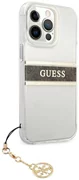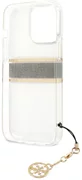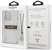 Étui Guess au caractère classique - boîtier classique transparent fini avec des rayures dorées et logo Guess placé sur l'impression en matériau Saffiano 4G.