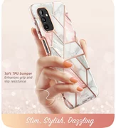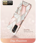 L'étui Supcase Cosmo est une forme mince de protection blindée. Le boîtier était composé de deux matériaux complémentaires : le TPU absorbant les chocs et le polycarbonate de renforcement. Cette conception, malgré les dimensions réduites par rapport aux étuis de blindage classiques, permet un amortissement efficace des chutes extrêmes. En outre, le panneau avant possède un cadre qui permet non seulement de séparer l'écran à la position directe du téléphone avec l'affichage sur la surface plane, mais protège également l'avant du téléphone des rayures lorsqu'il tombe sur des irrégularités.