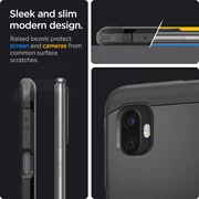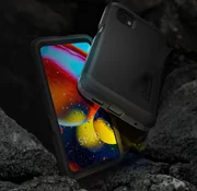 Cas de la série Armure robuste marques Spigen est la nouvelle couverture de l'entreprise. Sa construction en deux parties est faite de plastique thermoplastique résistant à l'abrasion et d'un cadre en polycarbonate de renforcement. À l'intérieur du couvercle se trouve un remplissage sous la forme d'une mousse technologique, qui fournit une couche de protection supplémentaire contre les chocs ou la chute de l'appareil.