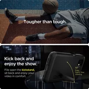 L'étui, équipé d'un pied, vous permet de regarder ce qui se passe sur l'écran du téléphone sans avoir à le tenir parfaitement. L'étui est parfaitement assorti et ne limite pas la possibilité de recharge sans fil. La forme légèrement surélevée de la coque autour de l'appareil photo et de l'écran le protège des rayures en plaçant le téléphone juste au-dessus de la surface plane. Il possède des boutons et des découpes pour les ports.