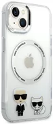 Il accentuera parfaitement le design unique de votre iPhone, l'étui étant orné de représentations du célèbre designer Karl Lagerfeld et de sa chatte Choupette. L'étui est équipé d'un anneau magnétique compatible avec le chargeur sans fil MagSafe, assurant une recharge rapide et facile.