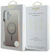 Cet étui élégant présente un subtil effet de dégradé et une surface pailletée qui lui confèrent un aspect unique et une grande élégance. L'anneau MagSafe est esthétiquement intégré au design, ce qui le rend non seulement fonctionnel mais aussi parfaitement harmonieux avec l'ensemble. Au centre de l'étui se trouve un délicat logo Guess doré qui ajoute un charme classique.