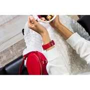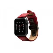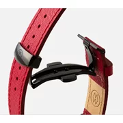 Monowear leather strap for women in red color with matte aluminum adapters in black color and dark gray butterfly clasp. The durable Saffiano leather finish and perfect processing will raise your Apple Watch to haute couture style.